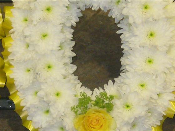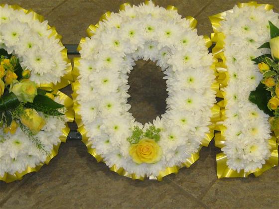 SON, based in white chrysanthemum with a yellow ribbon edge and yellow rose clusters.