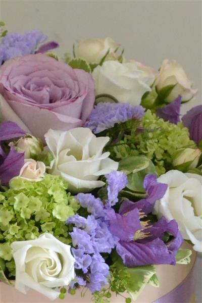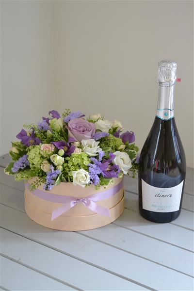 lavender and attractive foliage, arranged in a soft nude hatbox trimmed with ribbon. Photo depicts standard size. We have added a bottle of sparkling Prosecco to complete the celebration.