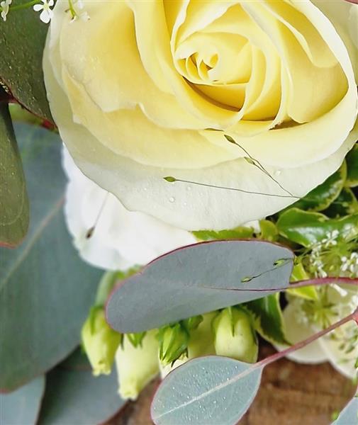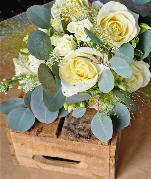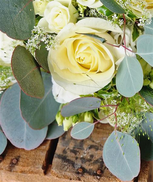 A timeless charm of white roses with the fresh natural appeal of eucalyptus. The bouquet exudes a sense of understated sophistication and classic beauty, perfect for a bride seeking a refined and graceful look. Containing white roses, eucalyptus and natural grasses.