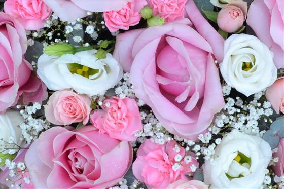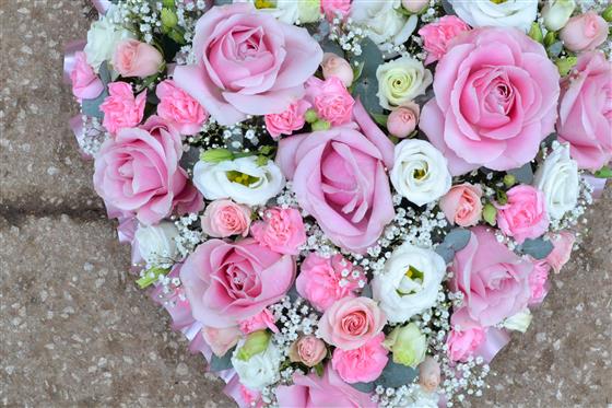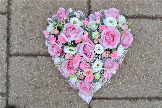 A pretty, feminine design pictured here on on a small heart frame (13 inch) in pink and white flowers, including large headed pink roses and gypsophila. Suitable for a child, young person or a grandma or great grandma.