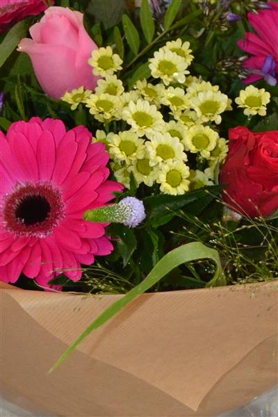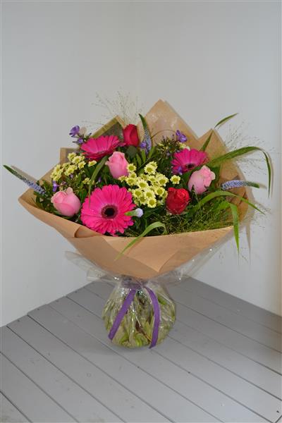 Featuring pink large headed roses, cream spray chrysanthemums, cerise gerbera, purple phlox, cerise roses and veronica, with pistache, salal and panicum grass, hand-tied, wrapped and presented in gift packaging. Photo depicts medium size.