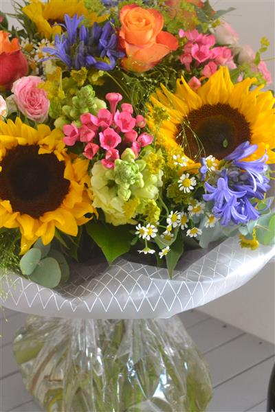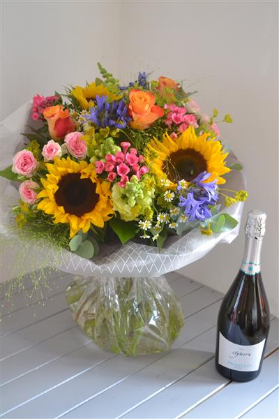 Vibrant and bright handtied bouquet, including Sunflowers and complementary,vibrant colour seasonal flowers. Presented in cellophane, with a water bubble aquapack to ensure freshness and one of our gift bags.Photo depicts standard price.Delivered with a bottle of Itinera Processco, perfect for celebrations and special anniversaries and birthdays. Presented in cellophane, with a water bubble aquapack to ensure freshness and one of our gift bags.Photo depicts standard price.