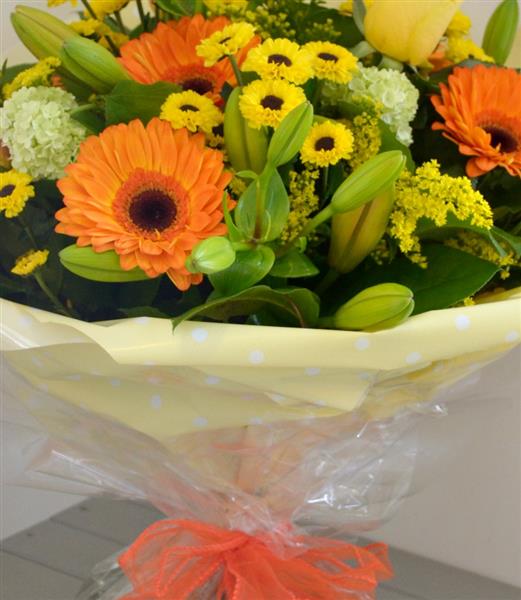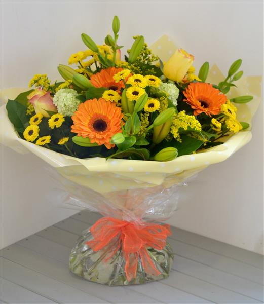Who could resist this cheerful hand tied in oranges and yellows, perfect to bring some sunshine into someone's life. Photo depicts standard price.