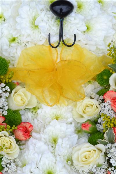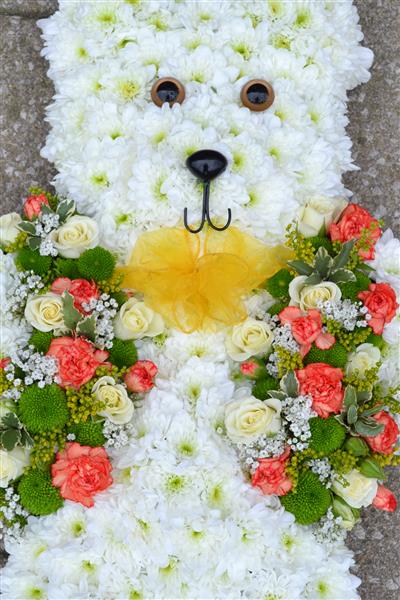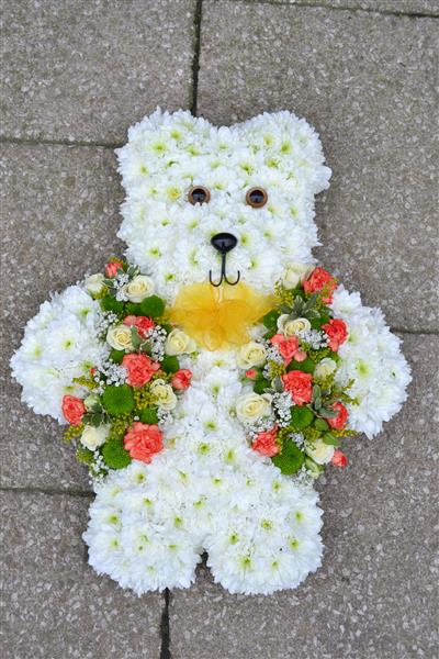 This teddy bear has been based in white chrysanthemums and has been given a lovely floral jacket with matching ribbon bow.