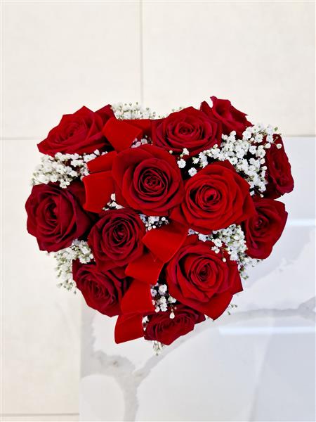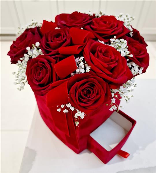 A velvet heart shaped box filled with 12 premium Naomi roses, scattered with gypsophila and finished with our luxurious velvet ribbon. The box can be kept as a keepsake or jewellery box. Heart box available in 2 colours: black and pink. Box size approx 19cm x 22cm.
