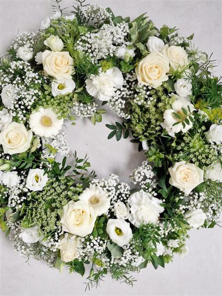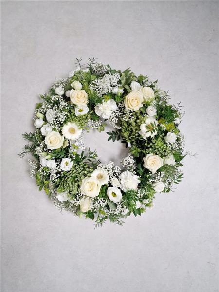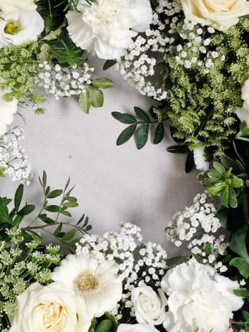 A graceful expression of love and remembrance, our White Floral Wreath is a timeless tribute to honor the memory of a loved one. Featuring delicate white roses, lisianthus, gerberas and gypsophilia. This wreath embodies purity, peace, and eternal love.