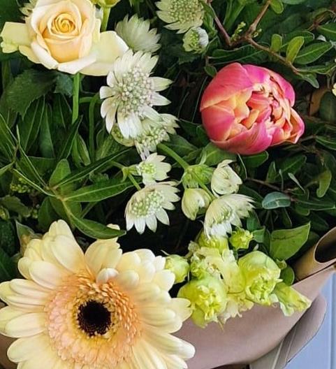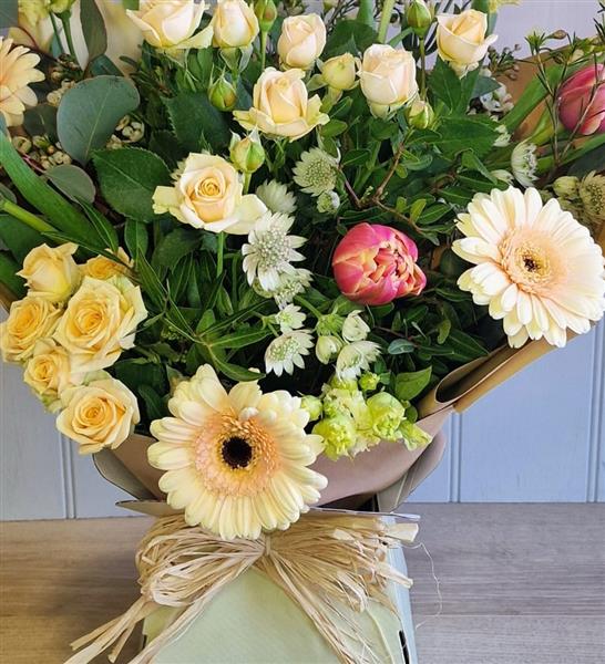 Soft, elegant, and full of charm, our Peach Blossom Hand-Tied bouquet is a delicate celebration of beauty and grace. Featuring creamy peach spray roses, gerberas, daisies and tulips. Wrapped in rustic kraft paper and finished with a raffia bow, it exudes timeless country-chic elegance.