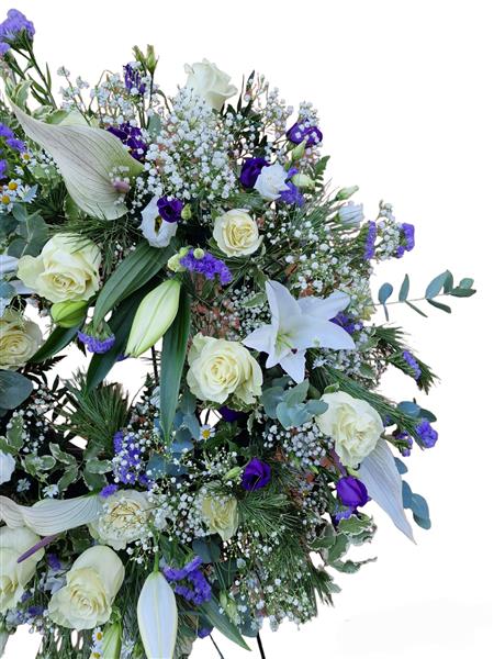 This large wild blue wreath is wonderful for a male tribute. Filled with white lilies, anthuriums, white roses, blue flowers and green seasonal foliage.
