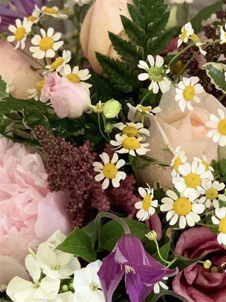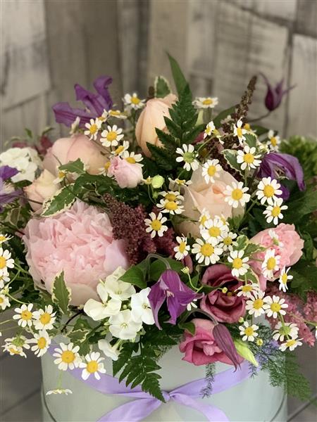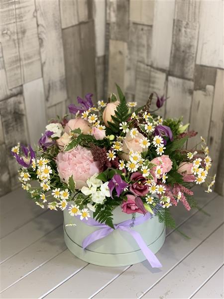 A collection of the best of the summer garden style flowers at the time of ordering with complimentary foliage. Design is styled in pastel shades and presented in large hatbox. Hatbox is approx. 8ins in diameter, overall design approx. 12ins.