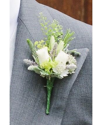 A cottage garden filled buttonhole with various grasses and white spray roses.