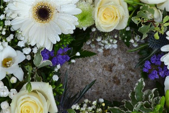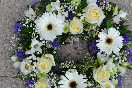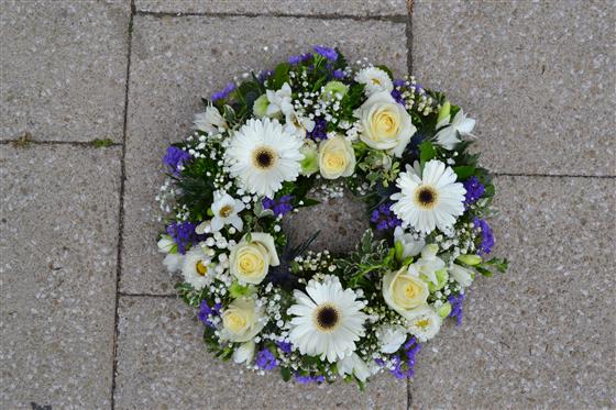 A classic selection of flowers in blues and whites including Roses and Gerbera nestled into this traditional circular wreath. Size shown 12inch frame