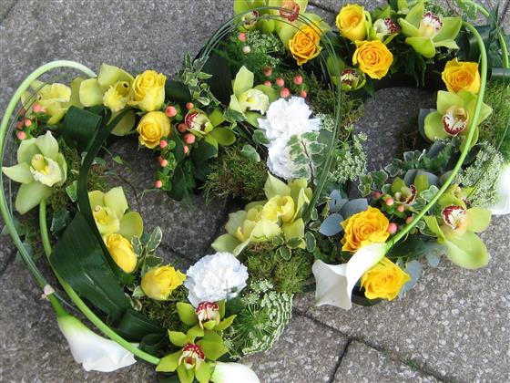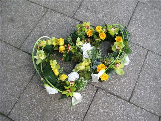 Mini cymbidium orchids, yellow large headed roses and white calla lilies are nestled into two open heart shapes. Loops of steel grass complete this elegant design.