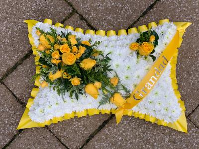 A classic pillow-shaped design created using a mass of white double spray chrysanthemums and finished with an elegant spray of yellow flowers including roses, filler flower and foliage. Edged with a yellow ribbon trim. Image depicts a medium size We have added a 'Grandad' sash to personalise the tribute. Other names available, call us on 0121 476 5795 or make a note in the delivery section of order.